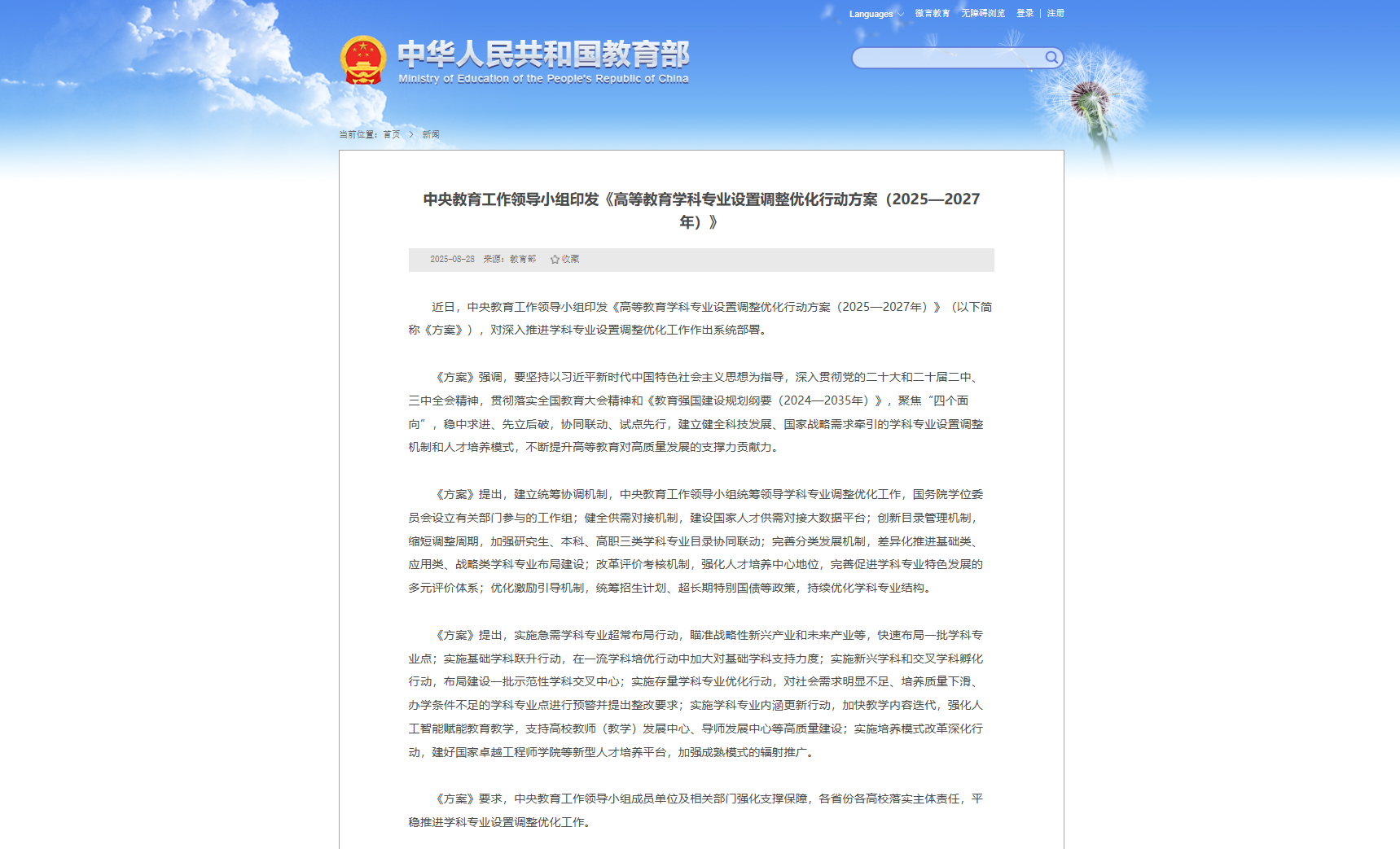 近日,中央教育工作領導小組正式印發(fā)《高等教育學科專業(yè)設置調(diào)整優(yōu)化行動方案(2025—2027年)》,對未來三年我國高等教育的“專業(yè)地圖”進行系統(tǒng)性擘畫。這標志著一場旨在增強教育服務國家戰(zhàn)略能力的深刻結(jié)構(gòu)性改革已全面啟動。